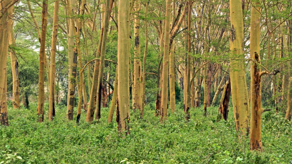 The Lerai Fever Tree Forest, which consists of tall, slim yellow barked acacias forming an airy, lace-canopied wonderland of glades, is much frequented by elephant, rhino, eland, bushbuck, hyrax, and hundreds of birds. These foliage are the preferred food of the rare, black rhinoceros, but the old forest is regenerating slowly, because of damage by elephants, which tear off whole branches rather than merely grazing.